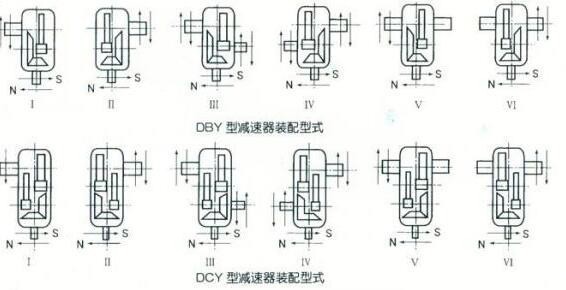 减速器按出轴形式可分为Ⅰ、Ⅱ、Ⅲ、Ⅳ、Ⅴ、Ⅵ六种装配型式,按旋转方向可分顺时针(S)和逆时针(N)两种方向,Ⅲ、Ⅳ、Ⅴ、Ⅵ型可装制动或逆制装置。如图。