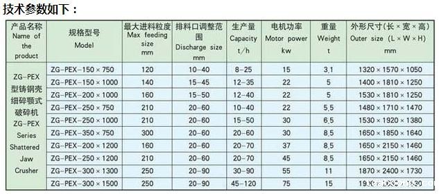 ZG-PEX型铸钢壳细碎颚式破碎机具有破碎性大、产品粒度均匀、结构简单、工作可靠、维修简便、运行费用经济等特点。广泛运用于矿山、冶炼、建材、公路、铁路、水利和化学工业等众多部门。